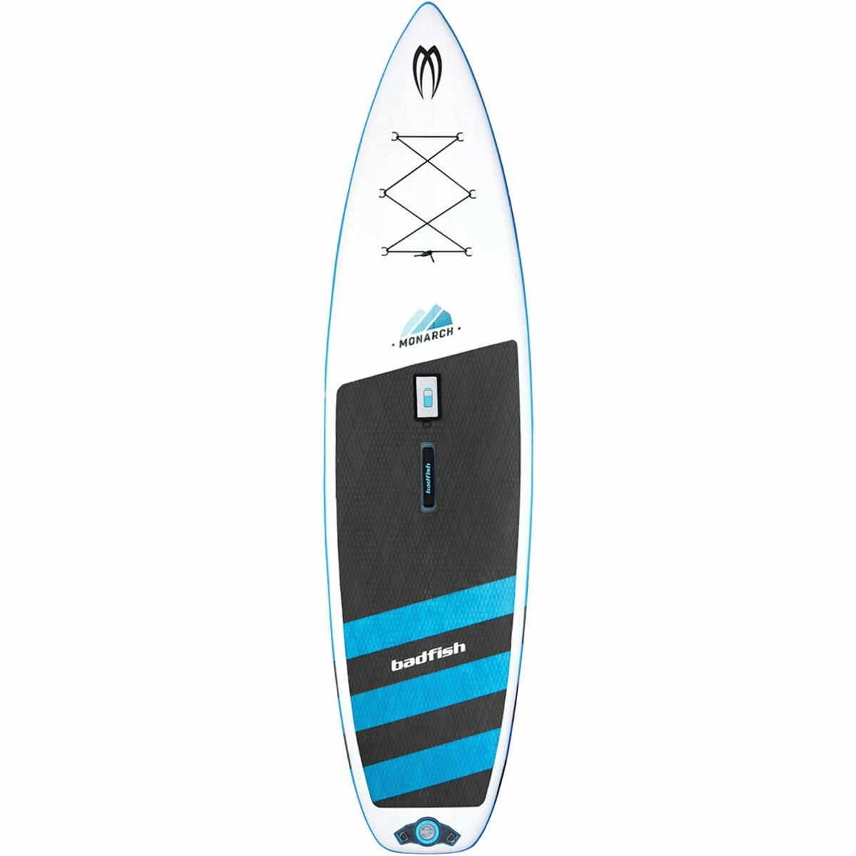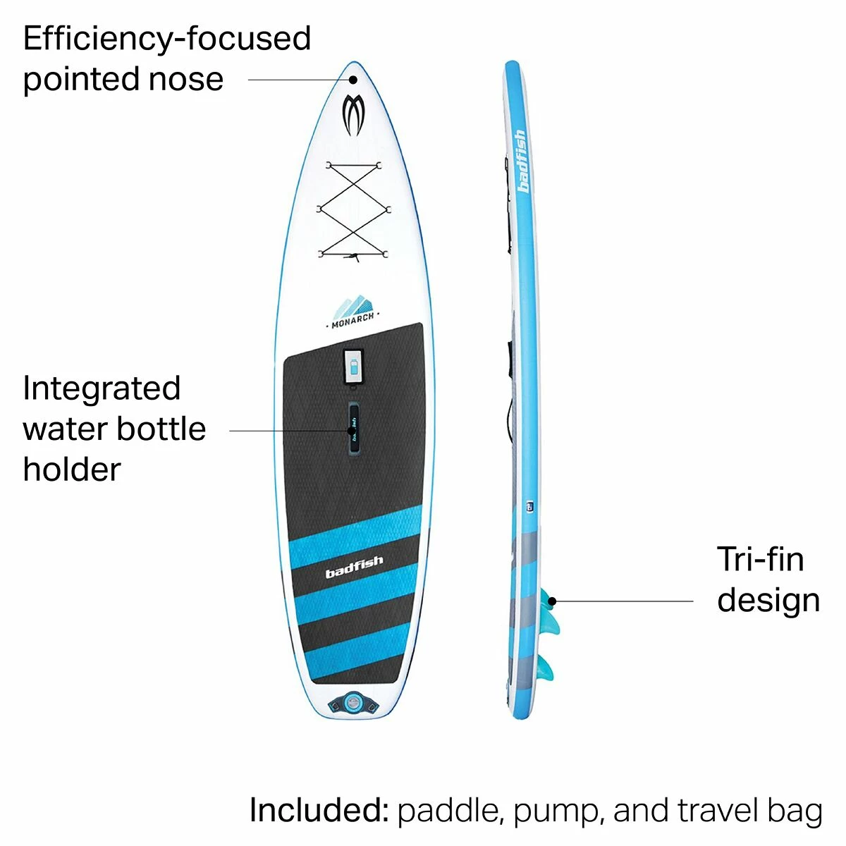 Whether you have a whole quiver of boards or you are just getting into the sport, you will find yourself pleased with the consistent performance of the Badfish Monarch Inflatable Stand-Up Paddleboard. This longboard is built for stability on unpredictable rivers and effortless paddling and glide on flatwater. The square-tailed, pointy-nosed shape further boosts the blend of stability and glide, while the padded top, and included water bottle holder ensures that you can stay comfortable during even the longest days on the water.