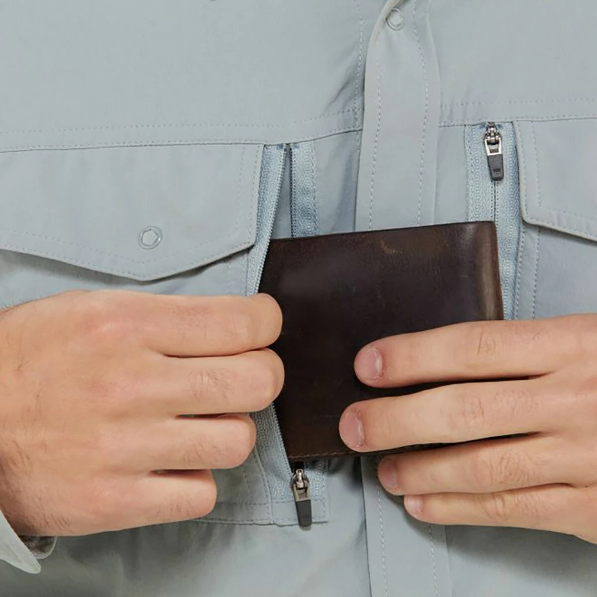- Pockets: 2 dual-entry chest (zippered, buttoned)