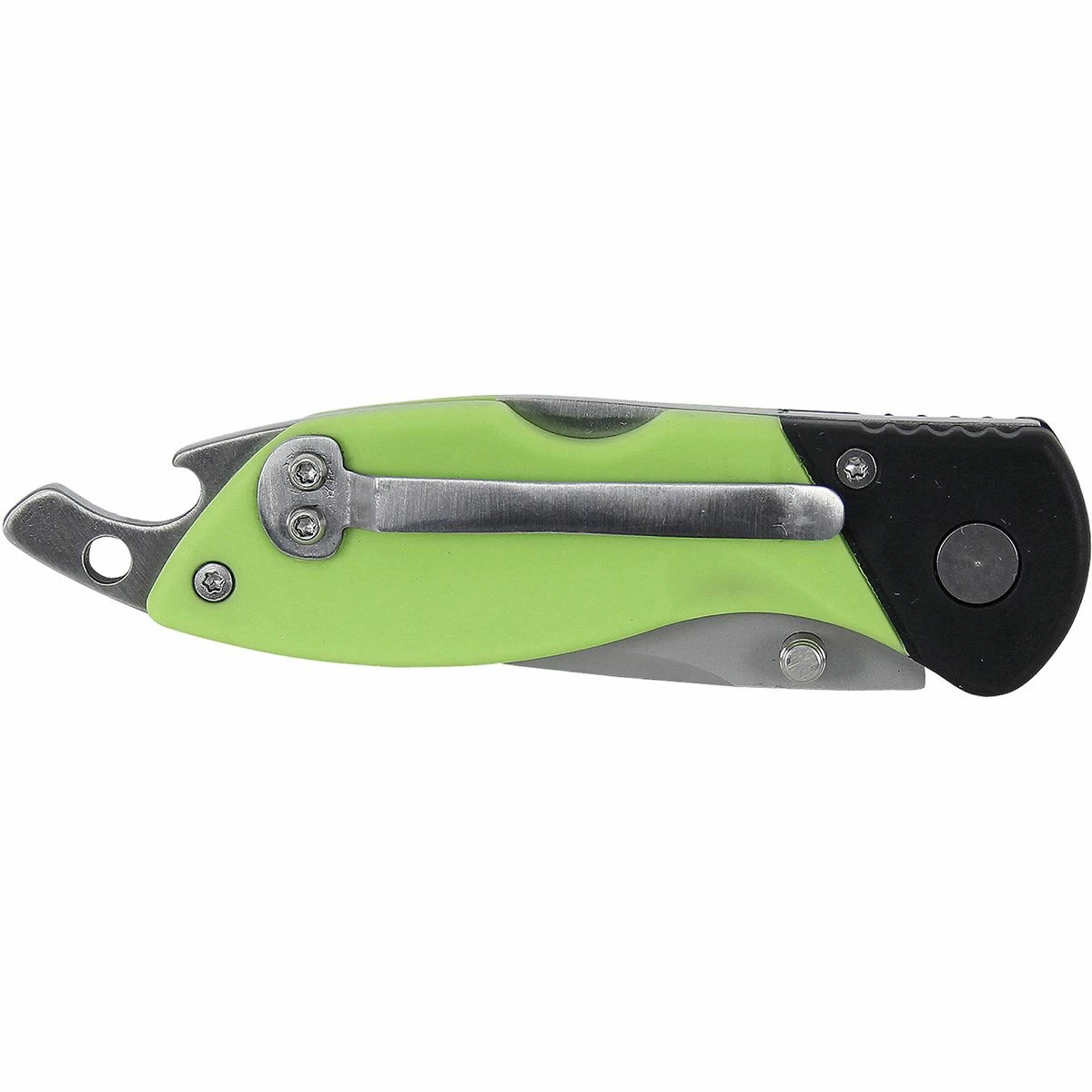 help you cut through a variety of objects. The glass-reinforced polypropylene handle utilizes a TPR over-mold to give you a good grip, and it features a bottle opener, a stainless steel clip, and a hole for a lanyard so you can tie it down in the boat.