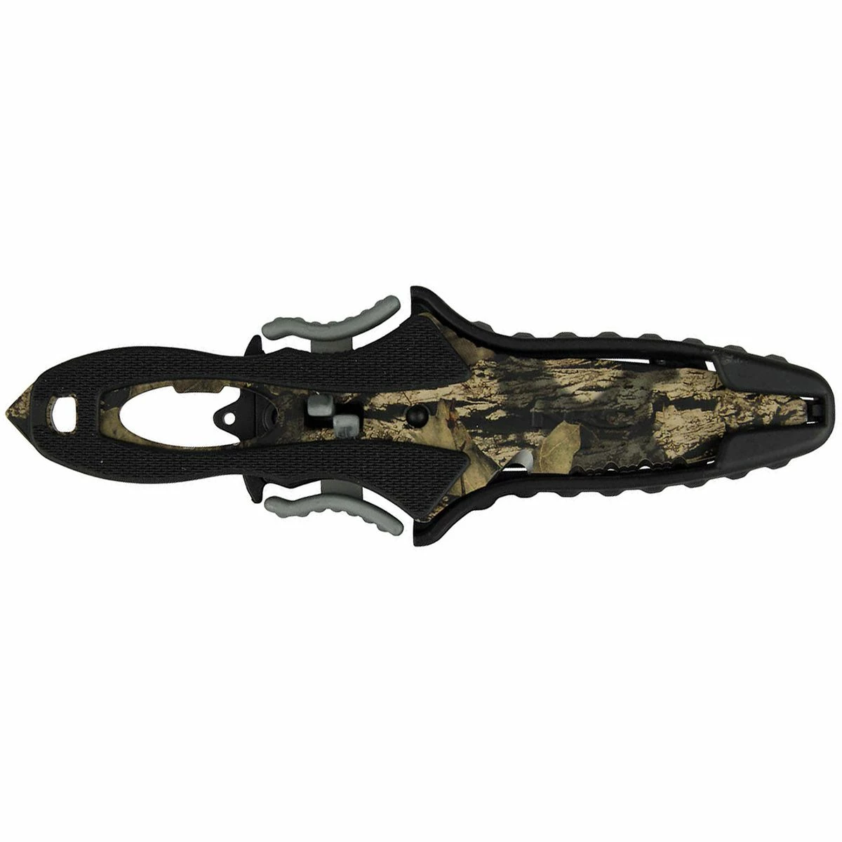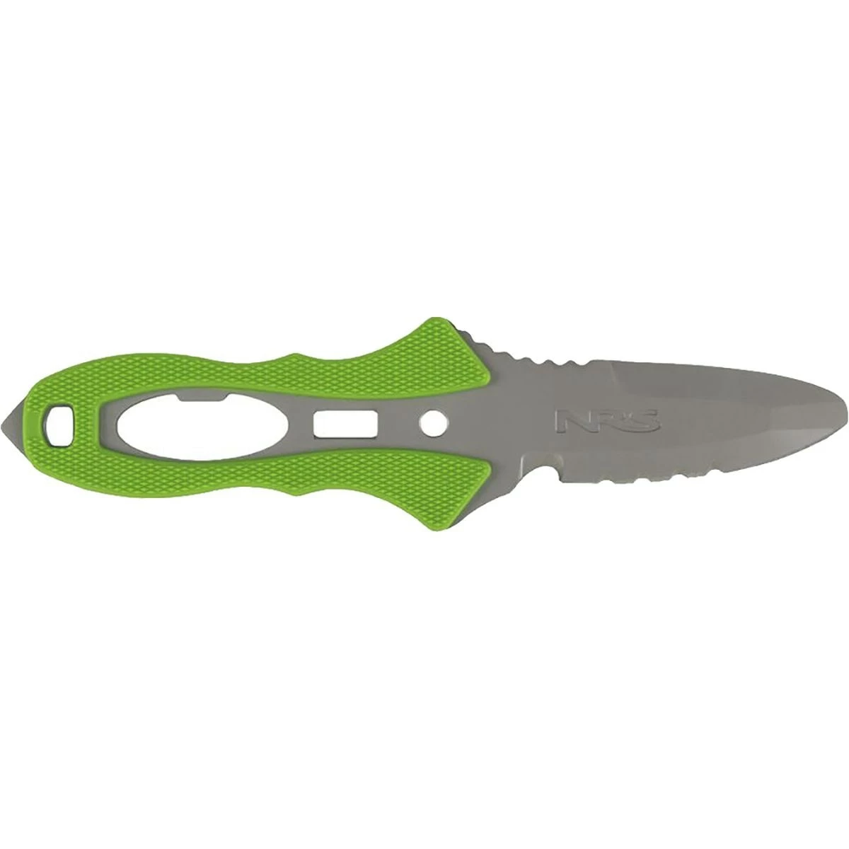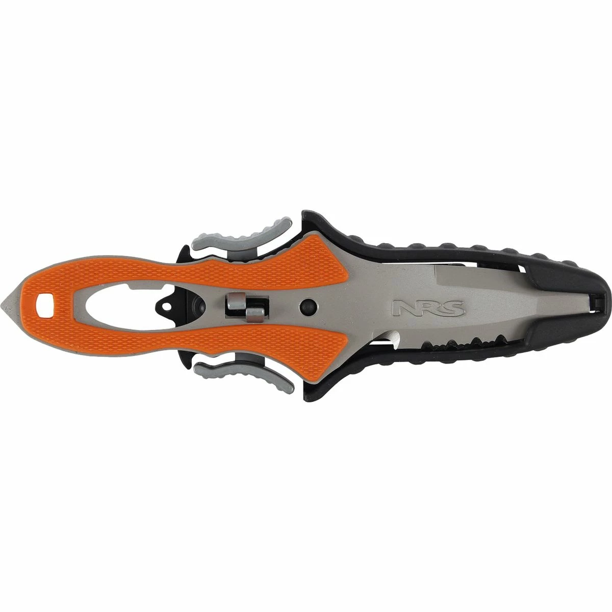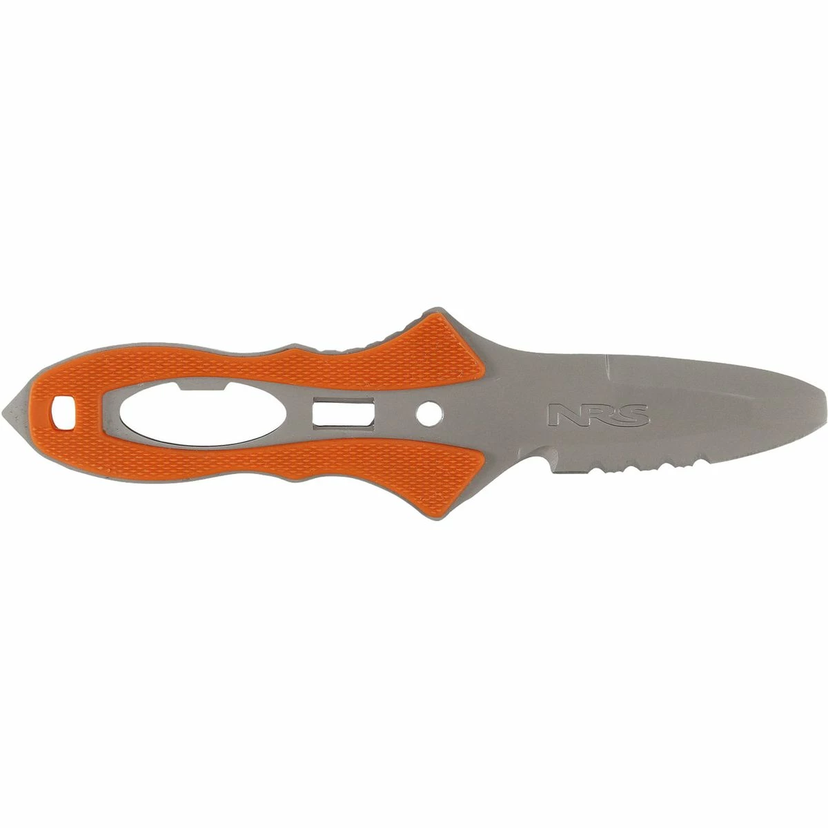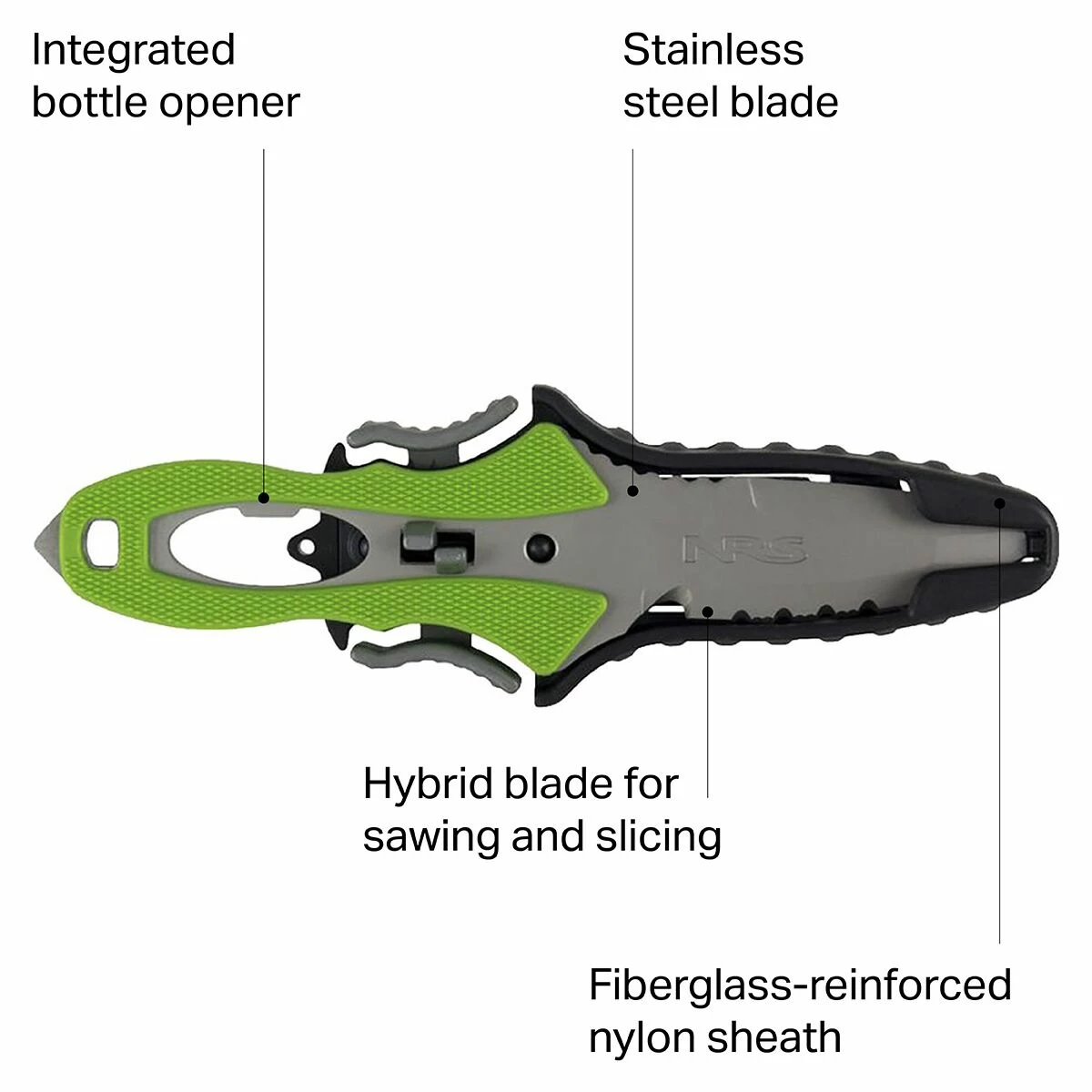 The glass-reinforced polypropylene handle utilizes a TPR over-mold to give you a good grip, and it features a rope-cutting hook, a glass-breaking point at the end, a bottle opener, and a square hole that doubles as a valve wrench for oxygen tanks. NRS made the sheath out of glass-reinforced nylon to keep it strong, and two release mechanisms prevent the blade from falling out while you paddle. The sheath attaches to PFD lash tabs so you can always access it.
