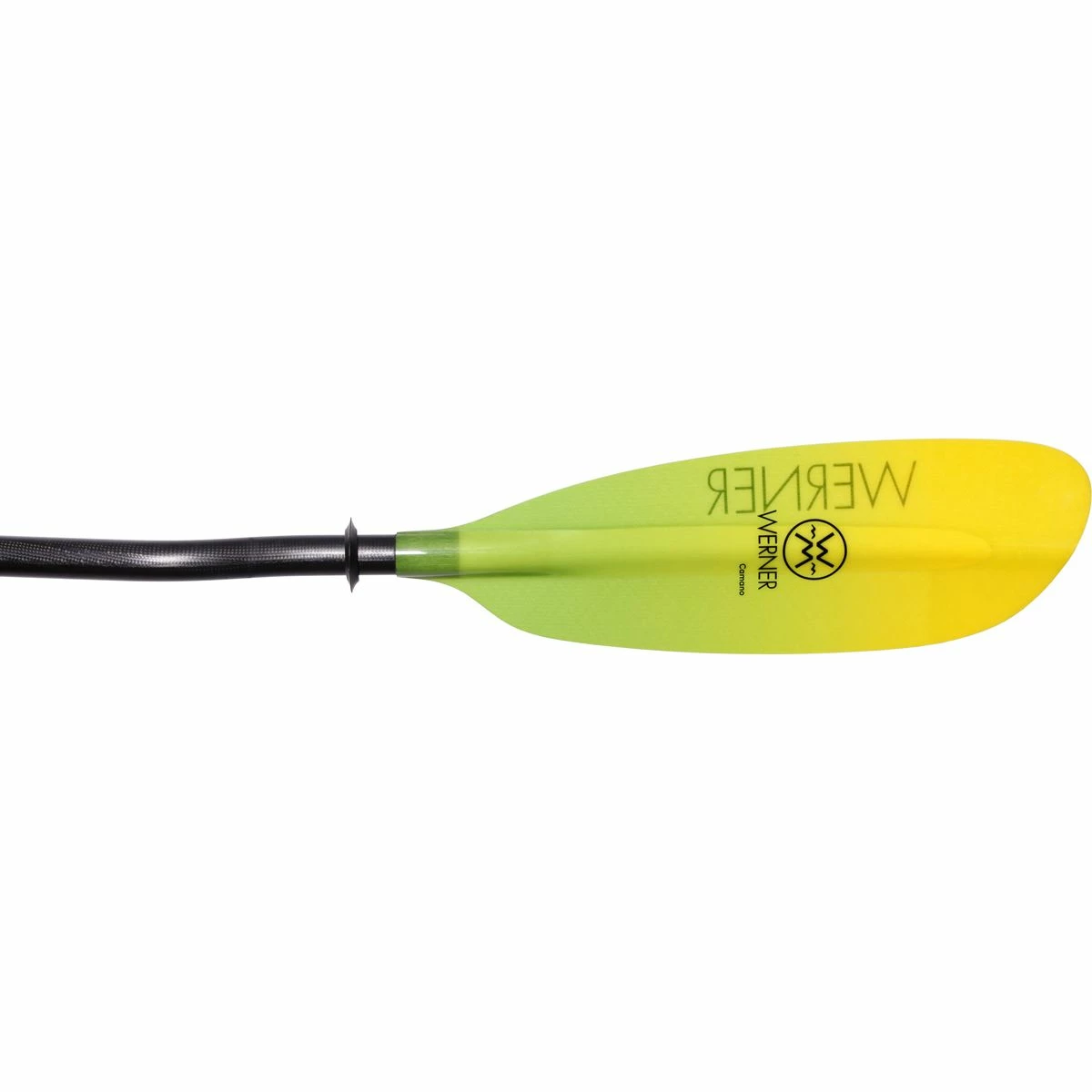 The bent shaft of the Werner Camano 2-Piece Paddle is designed to help promote a smooth stroke and limit fatigue for paddlers who want to enjoy their time on the water, and the durable fiberglass blades are sized and shaped to suit non-aggressive, easy-cadence paddling strokes.