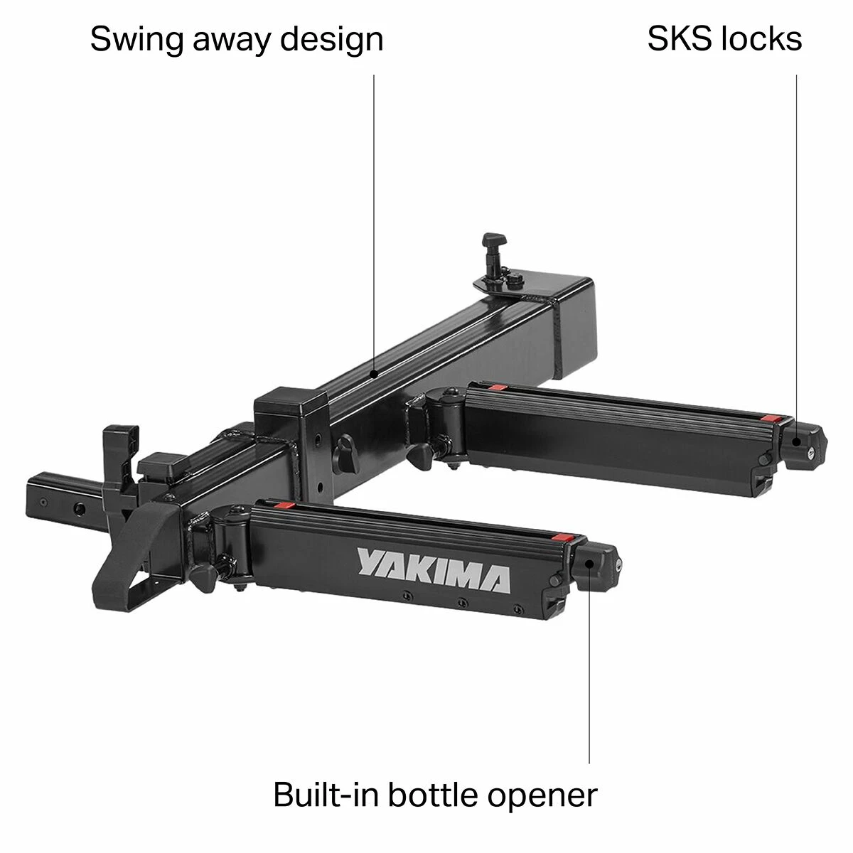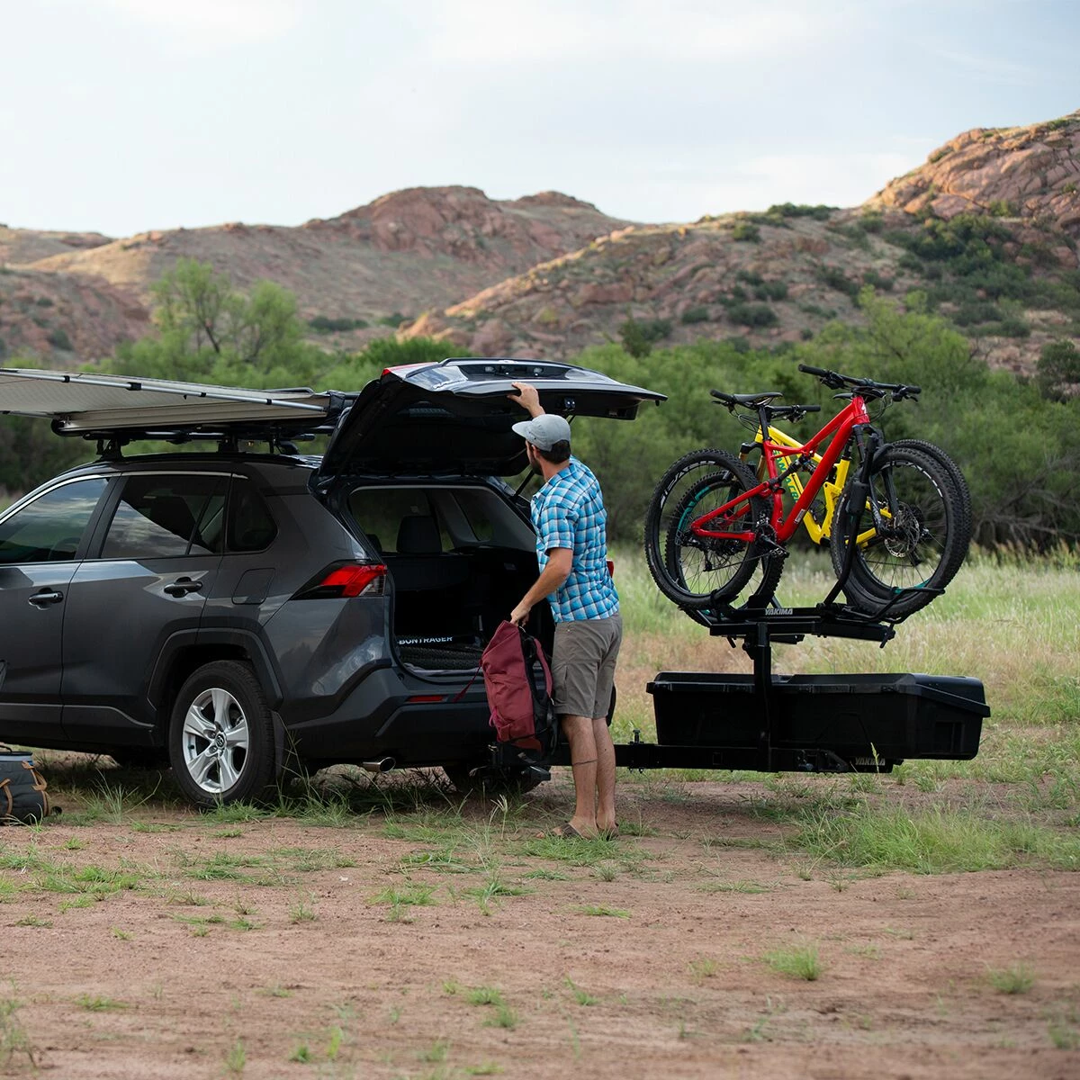 With the EXO SwingBase on our hitch, we’re ready to haul our gear no matter what pursuit we’re after. All other EXO components attach to this foundation in seconds thanks to the tool-free system and locking knobs. So, whether we’re off to carve down powdery mountains or to tear up singletrack, our kit is loaded and organized within minutes. Once geared up, the load swings out of the way, so we can pop the hatch for our furry comrade to hop in.
