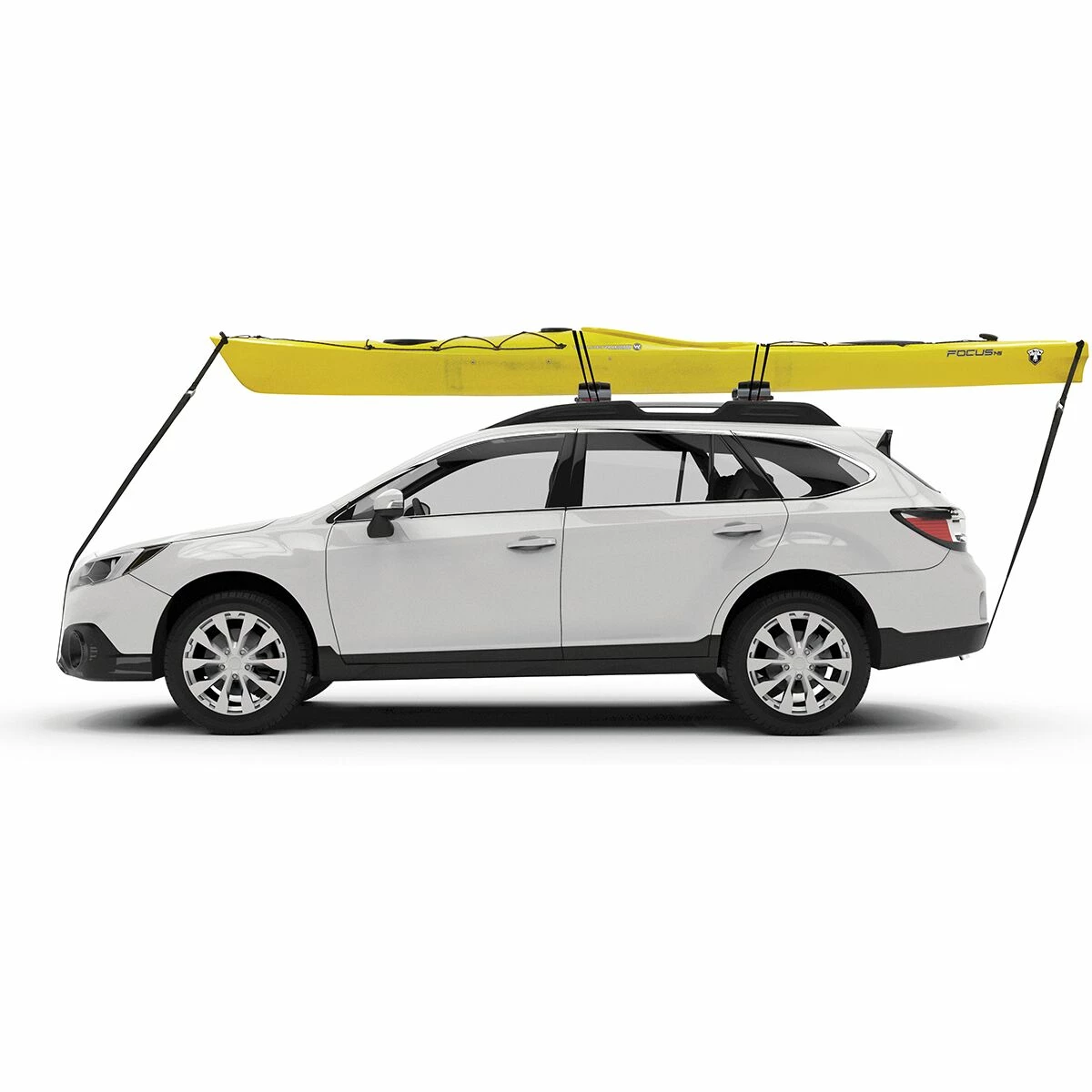The Yakima Evenkeel canoe and kayak rack secures any size recreational, touring, sit-on-top, or whitewater boat to the top of any brand or factory crossbars. The quick grip claw design easily mounts to square, round, flat, or any other shape crossbar, which means no additional parts or tools to attach.